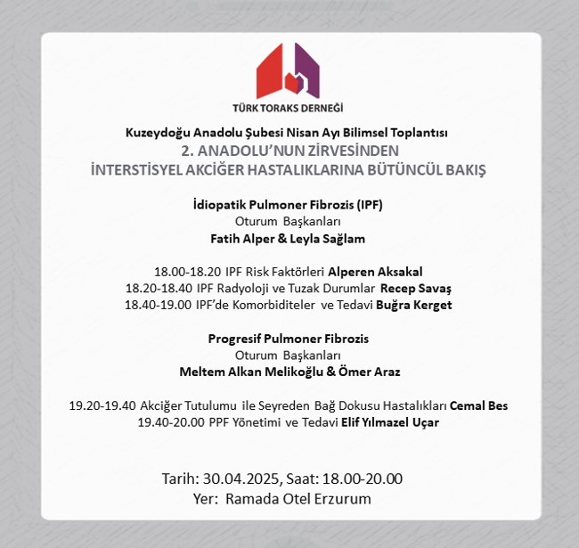 Türk Toraks Derneği Kuzeydoğu Anadolu Şubesi Nisan Ayı Bilimsel Toplantı Duyurumuz: "2. Anadolu’nun Zirvesinden İnterstisyel Akciğer Hastalıklarına Bütüncül Bakış"