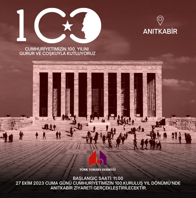 Türk Toraks Derneği Merkez Yönetim Kurulu olarak “CUMHURİYETİMİZİN 100.KURULUŞ YIL DÖNÜMÜ’NDE” Cumhuriyet'in kurucusu Ulu Önder Mustafa Kemal Atatürk'ün ebedi istirahatgahı olan Anıtkabir’i 27 Ekim 2023 Cuma günü saat 11:00’da ziyaret edeceğiz.