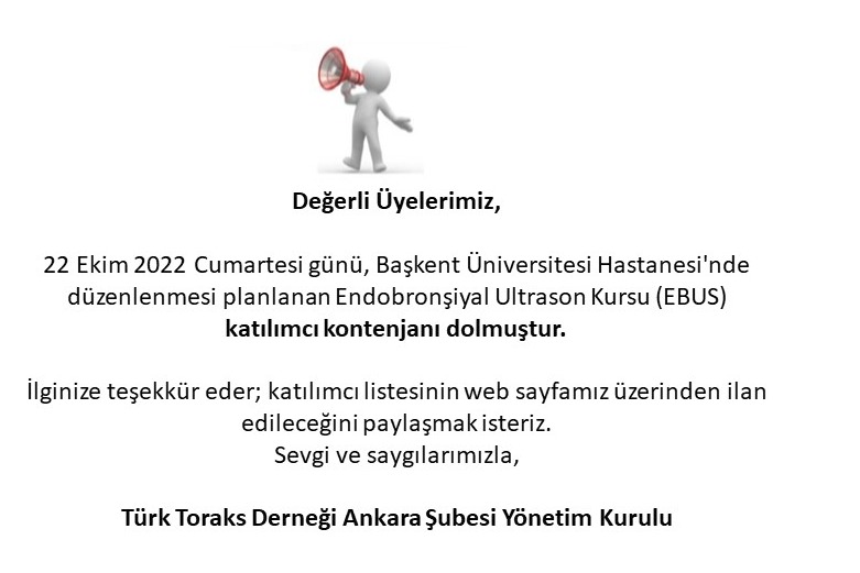 22 Ekim 2022 Cumartesi günü, Başkent Üniversitesi Hastanesi'nde düzenlenmesi planlanan Endobronşiyal Ultrason Kursu (EBUS) katılımcı kontenjanı dolmuştur.