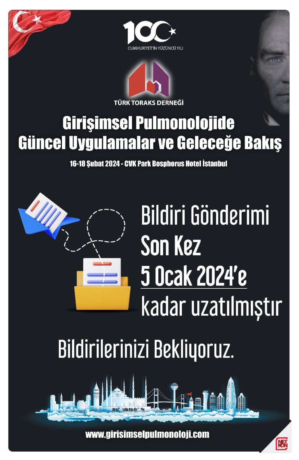 16-18 Şubat 2024 tarihleri arasında İstanbul'da gerçekleştirilecek olan "Girişimsel Pulmonolojide Güncel Uygulamalar ve Geleceğe Bakış" Sempozyumu bildiri gönderim tarihi son kez 5 Ocak 2024'e kadar uzatılmıştır.