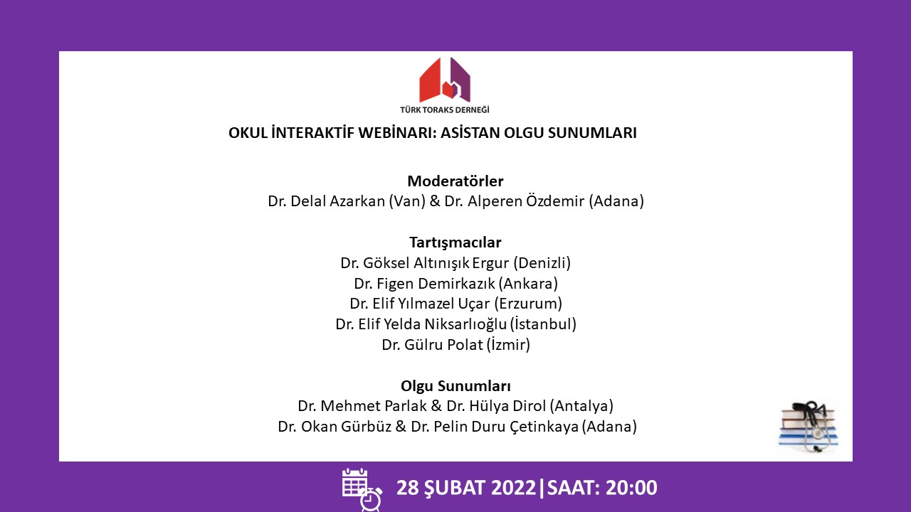 Türk Toraks Derneği okulu interaktif webinarının ikincisi 28 Şubat 2022 Pazartesi günü, saat 20.00 da “Asistan Olgu Sunumları” başlığı ile gerçekleştirilecek olup; katılımlarınız onur verecektir.