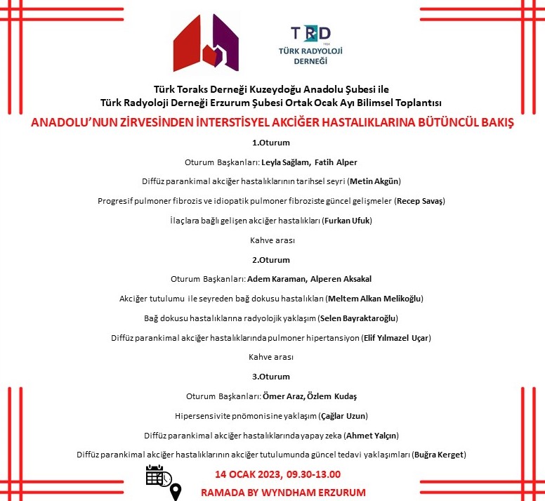 Türk Toraks Derneği Kuzeydoğu Anadolu Şubesi ile Türk Radyoloji Derneği Erzurum Şubesi ortak Ocak ayı bilimsel toplantısı 14 Ocak 2023 Cumartesi günü, 09.30-13.00 saatleri arasında Erzurum' da gerçekleşecektir.