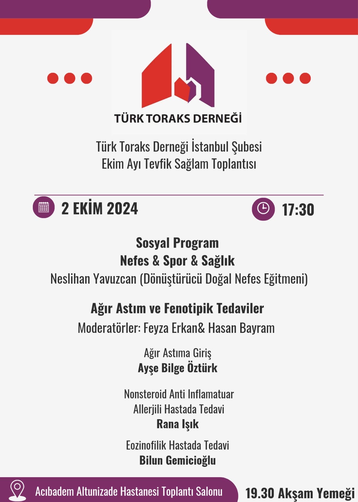Türk Toraks Derneği İstanbul Şubesi Ekim Ayı Tevfik Sağlam Toplantısı Duyurumuz "Ağır Astım ve Fenotipik Tedaviler""