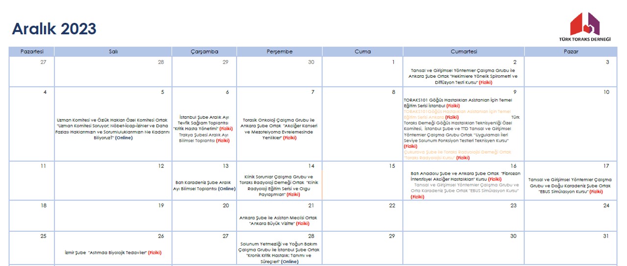 Türk Toraks Derneği Aralık 2023 Etkinlik Takvimi