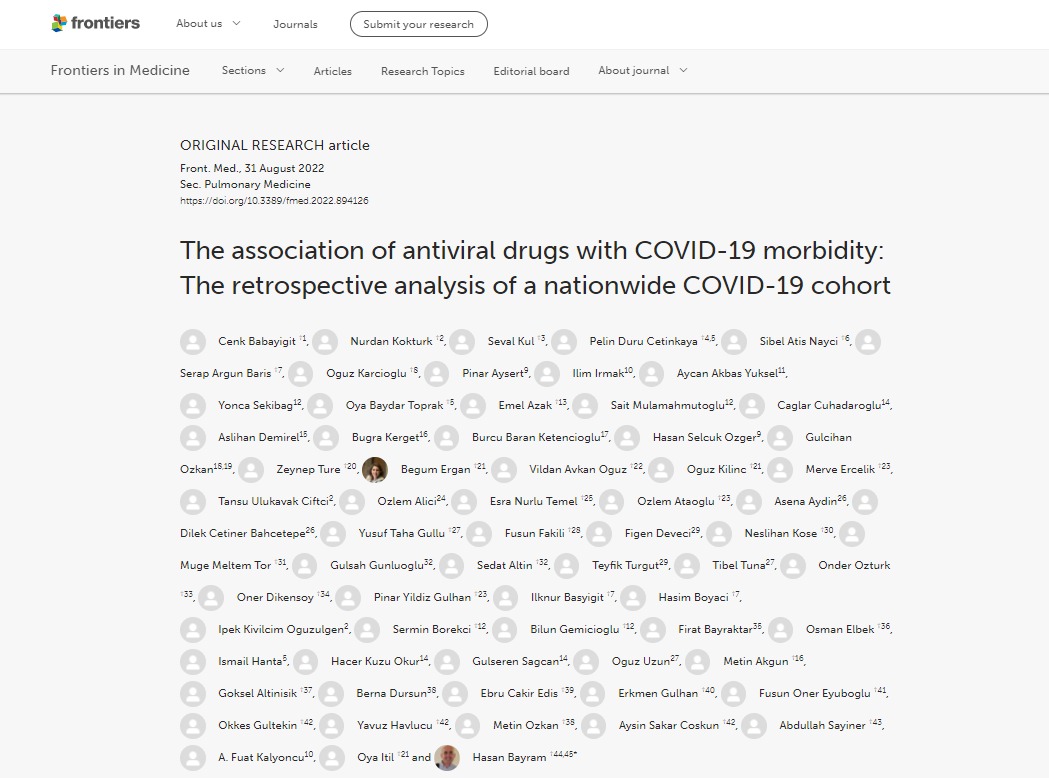 "The Association Of Antiviral Drugs With COVID-19 Morbidity: The Retrospective Analysis Of A Nationwide COVID-19 Cohort" Başlıklı Makale Frontiers İn Medicine Dergisinde Yayımlanmıştır