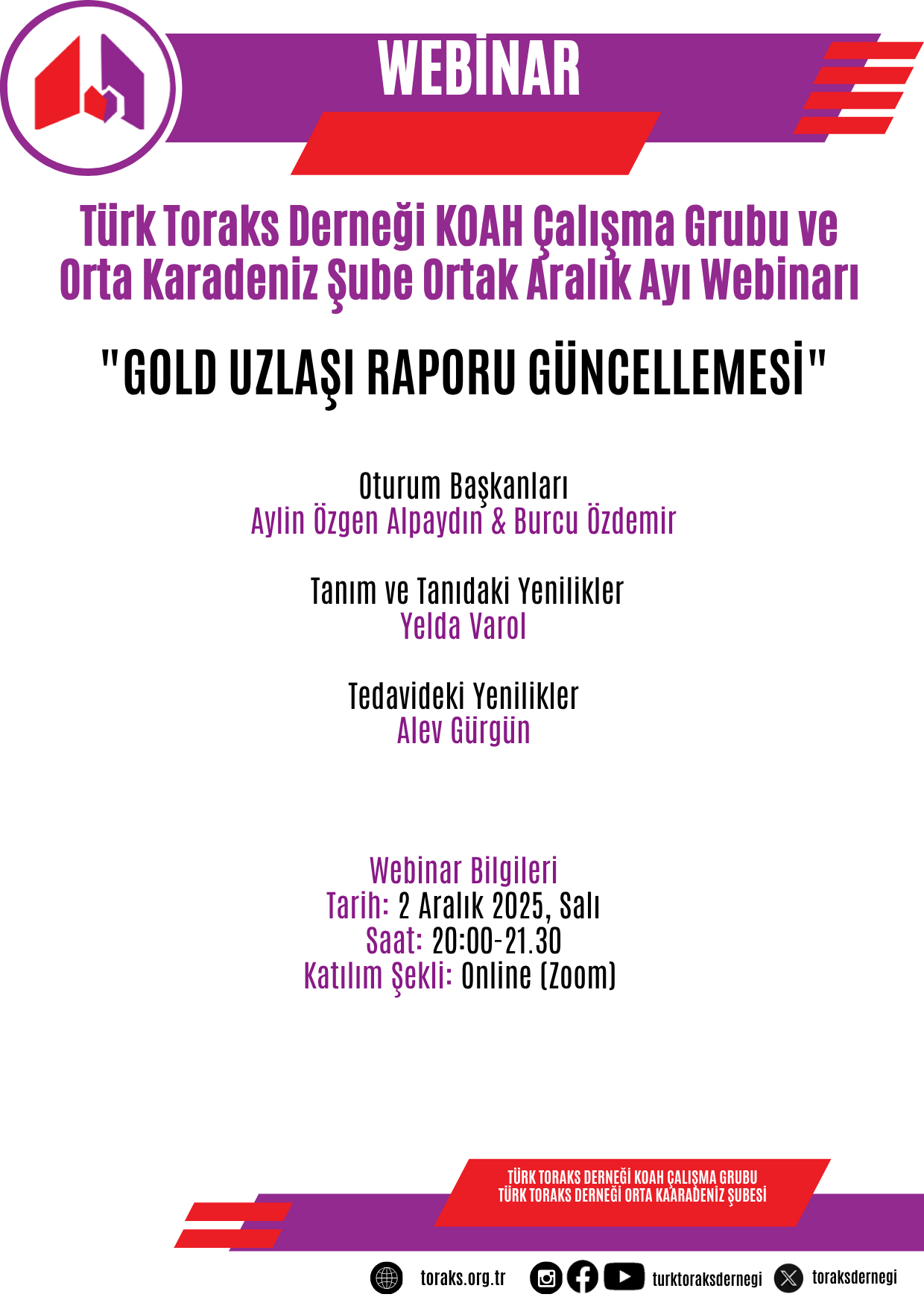 Türk Toraks Derneği KOAH Çalışma Grubu'nun Orta Karadeniz Şubesi ile ortak düzenlediği Aralık ayı webinarı "GOLD Uzlaşı Raporu Güncellemesi" başlığı ile 2 Aralık 2025 Salı günü, 20.00-21.30 saatleri arasında online olarak gerçekleştirilecektir.