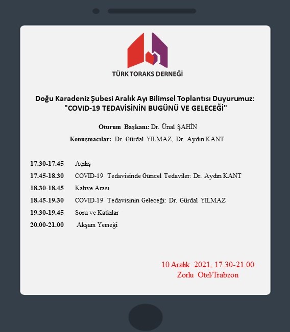 Türk Toraks Derneği Doğu Karadeniz Şubesi Aralık Ayı Bilimsel Toplantısı Duyurumuz: "COVID-19 Tedavisinin Bugünü ve Geleceği"