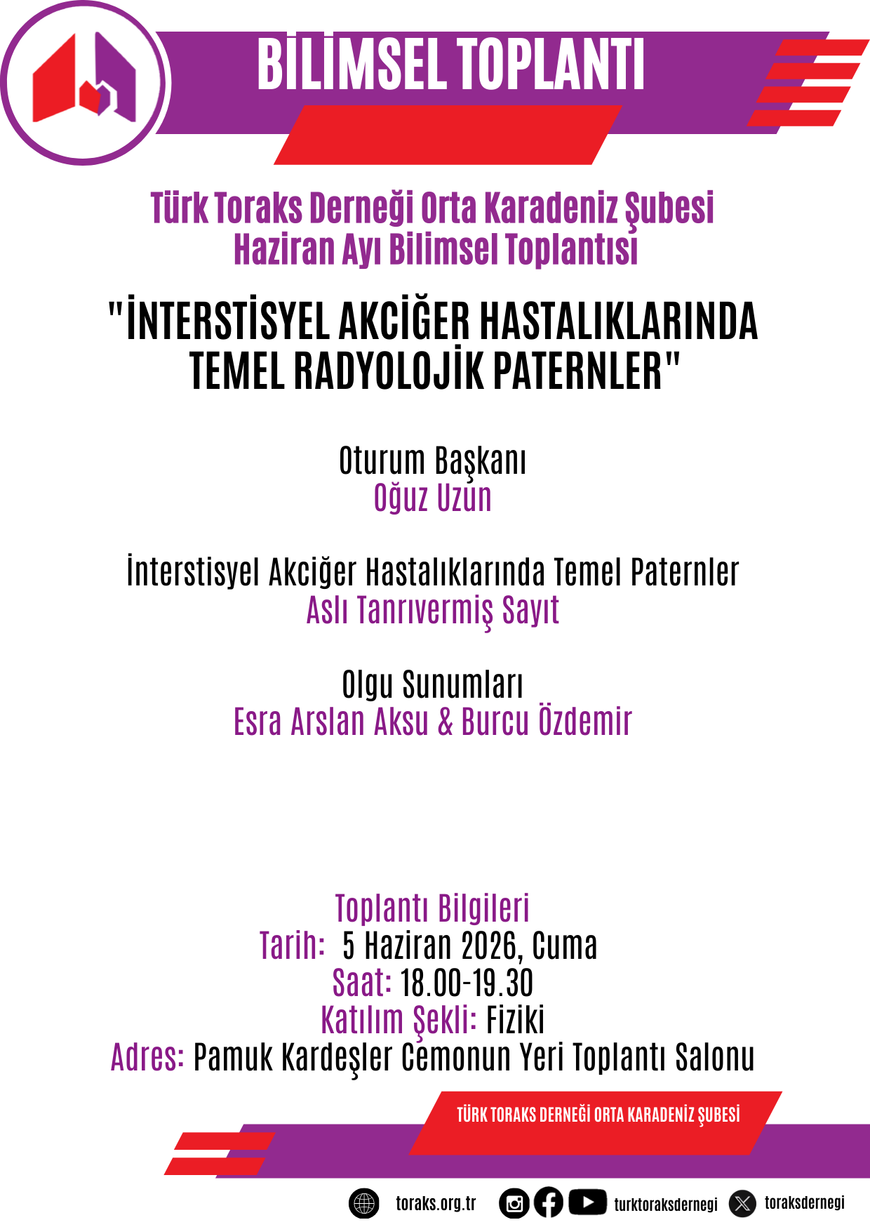 Türk Toraks Derneği Orta Karadeniz Şubesi Haziran ayı bilimsel toplantısı 5 Haziran 2026 Cuma günü, 18.00-19.30 saatleri arasında Samsun' da gerçekleştirilecektir.