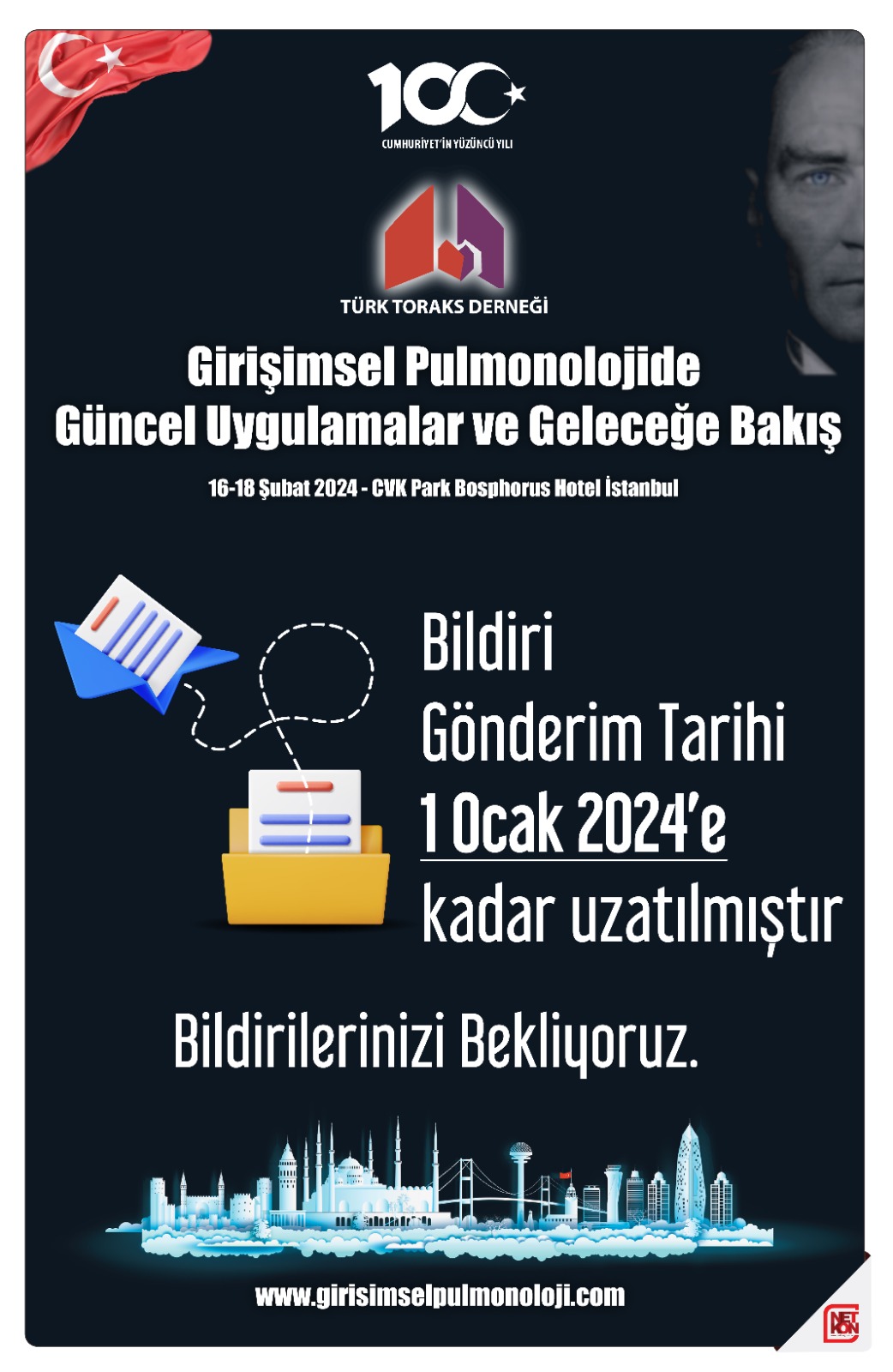 16-18 Şubat 2024 tarihleri arasında İstanbul'da gerçekleştirilecek olan "Girişimsel Pulmonolojide Güncel Uygulamalar ve Geleceğe Bakış" Sempozyumu bildiri gönderim tarihi 1 Ocak 2024'e kadar uzatılmıştır.