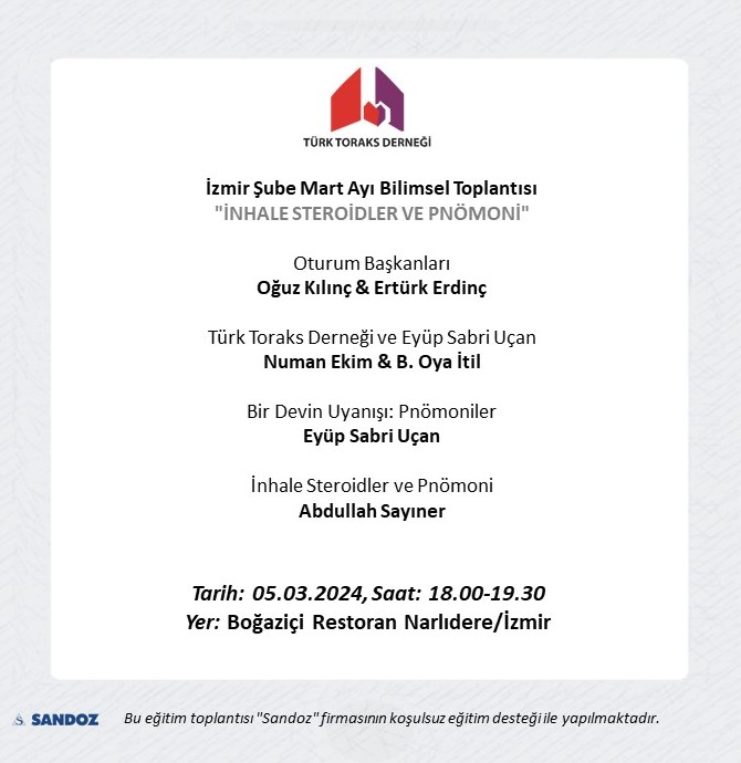 Türk Toraks Derneği İzmir Şubesi Mart Ayı Bilimsel Toplantı Duyurumuz: "İnhale Steroidler ve Pnömoni"