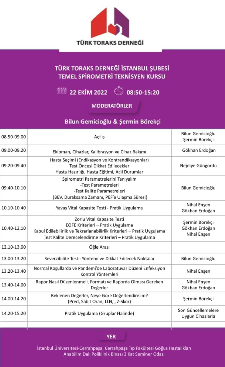 Türk Toraks Derneği İstanbul Şubesi “Temel Spirometri Teknisyen" kursu 22 Ekim 2022 tarihinde İstanbul' da gerçekleşecektir.