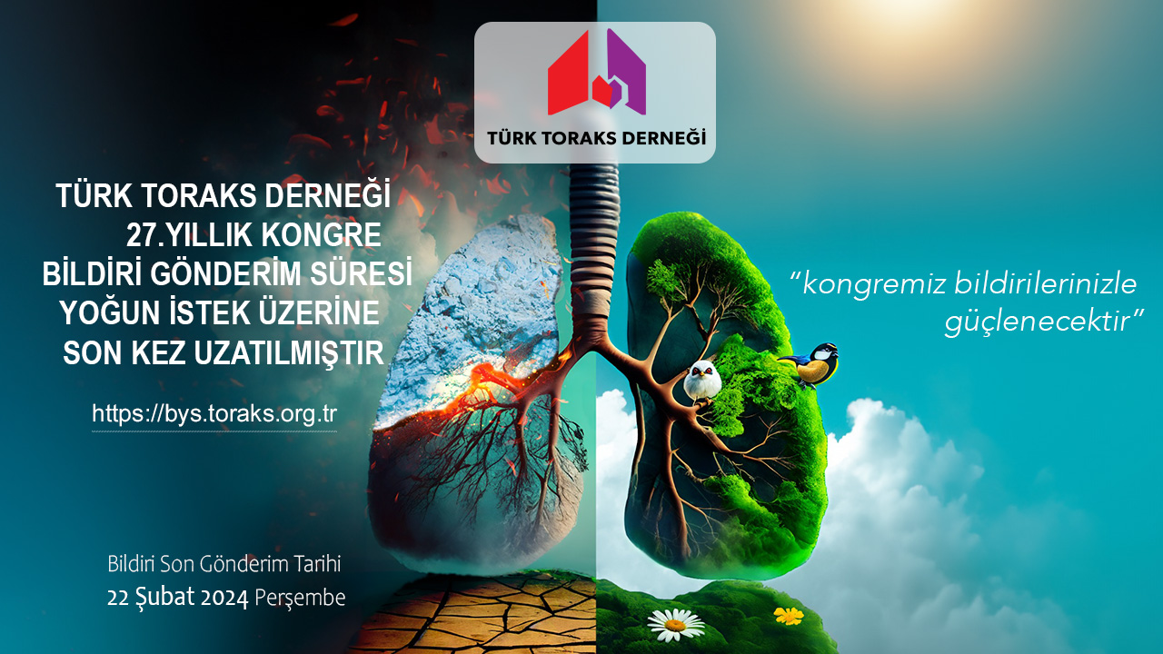 Türk Toraks Derneği 27. Yıllık Kongre bildiri gönderim süresi yoğun istek üzerine son kez 22 Şubat 2024 Perşembe gününe kadar uzatılmıştır !!!