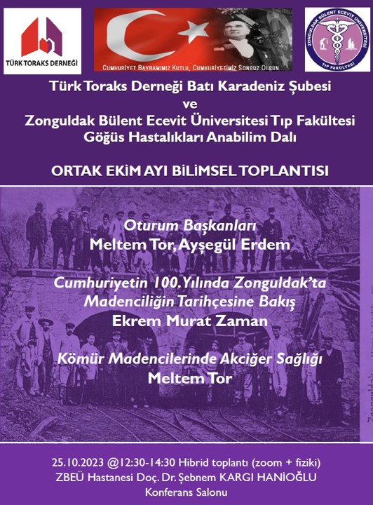 Türk Toraks Derneği Batı Karadeniz Şubesi ve Zonguldak Bülent Ecevit Üniversitesi Tıp Fakültesi Göğüs Hastalıkları Anabilim Dalı ortak Ekim ayı bilimsel toplantısı "Cumhuriyetin 100. Yılında Zonguldak’ta Madenciliğin Tarihçesine Bakış ve Madencilerde Akciğer Sağlığı" başlığı ile 25 Ekim 2023 Çarşamba günü, 12.30-14.30 saatleri arasında Zonguldak'ta hibrit (zoom+fiziki) olarak gerçekleşecektir.