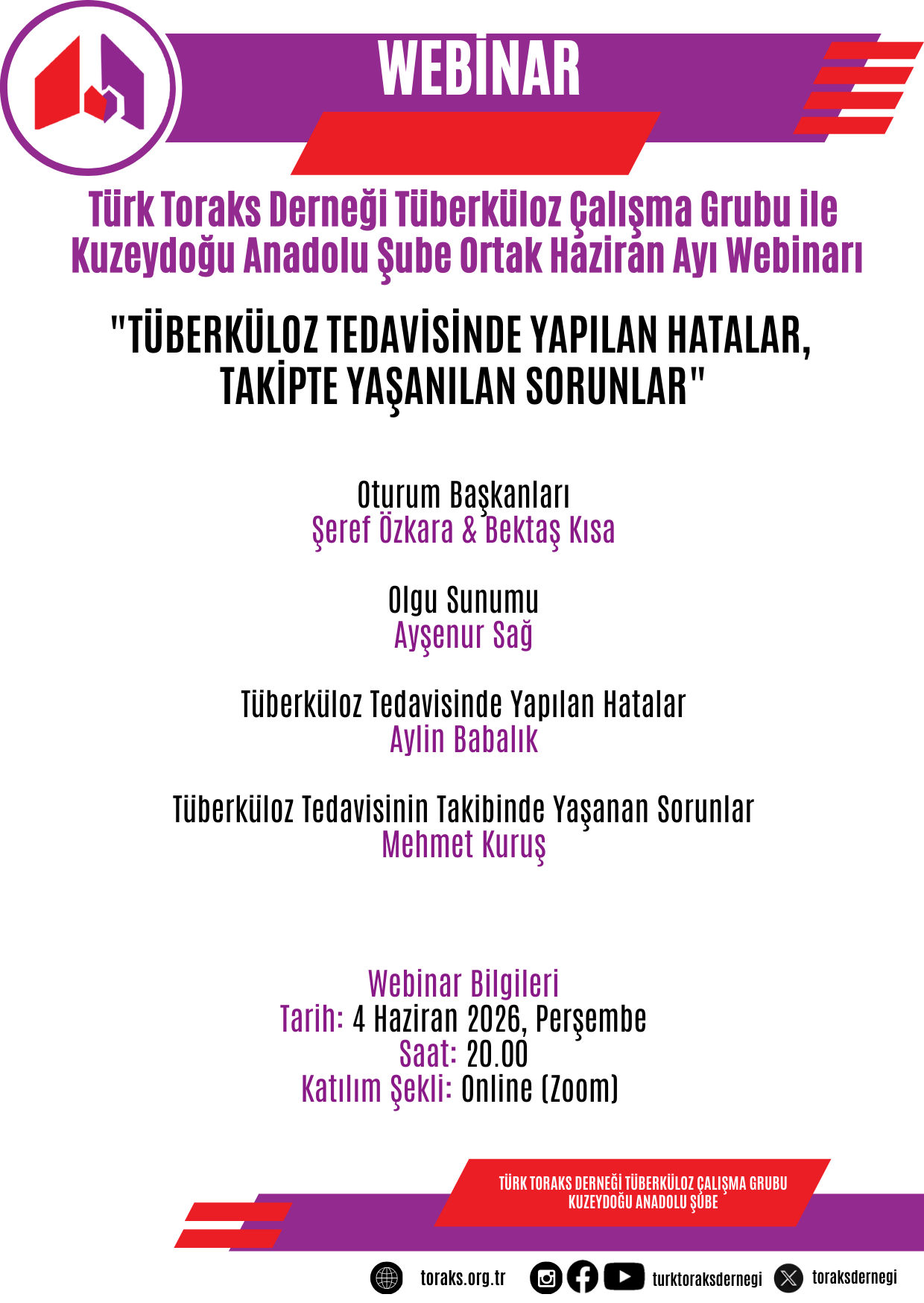 24 Mart Dünya Tüberküloz Günü nedeni ile Türk Toraks Derneği Tüberküloz Çalışma Grubu'nun Kuzeydoğu Anadolu Şube ile ortak düzenlediği Haziran ayı webinarı "Tüberküloz Tedavisinde Yapılan Hatalar, Takipte Yaşanılan Sorunlar" başlığı ile 4 Haziran 2026 Perşembe günü, saat 20.00' da online olarak gerçekleştirilecektir.
