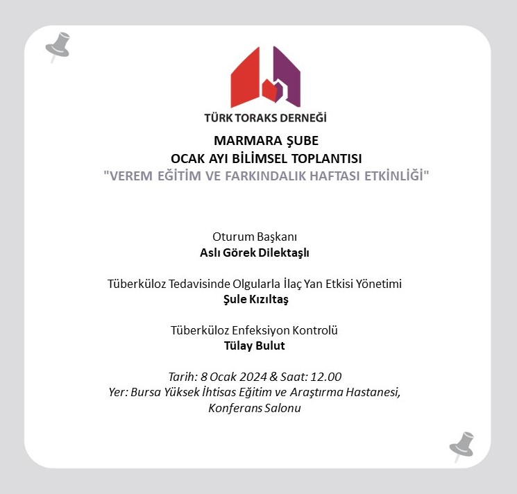 Verem Eğitim ve Farkındalık Haftası etkinliği olarak Türk Toraks Derneği Marmara Şubesi Ocak ayı bilimsel toplantısı 8 Ocak 2024 Pazartesi günü, saat 12.00 da Bursa' da gerçekleştirilecektir.