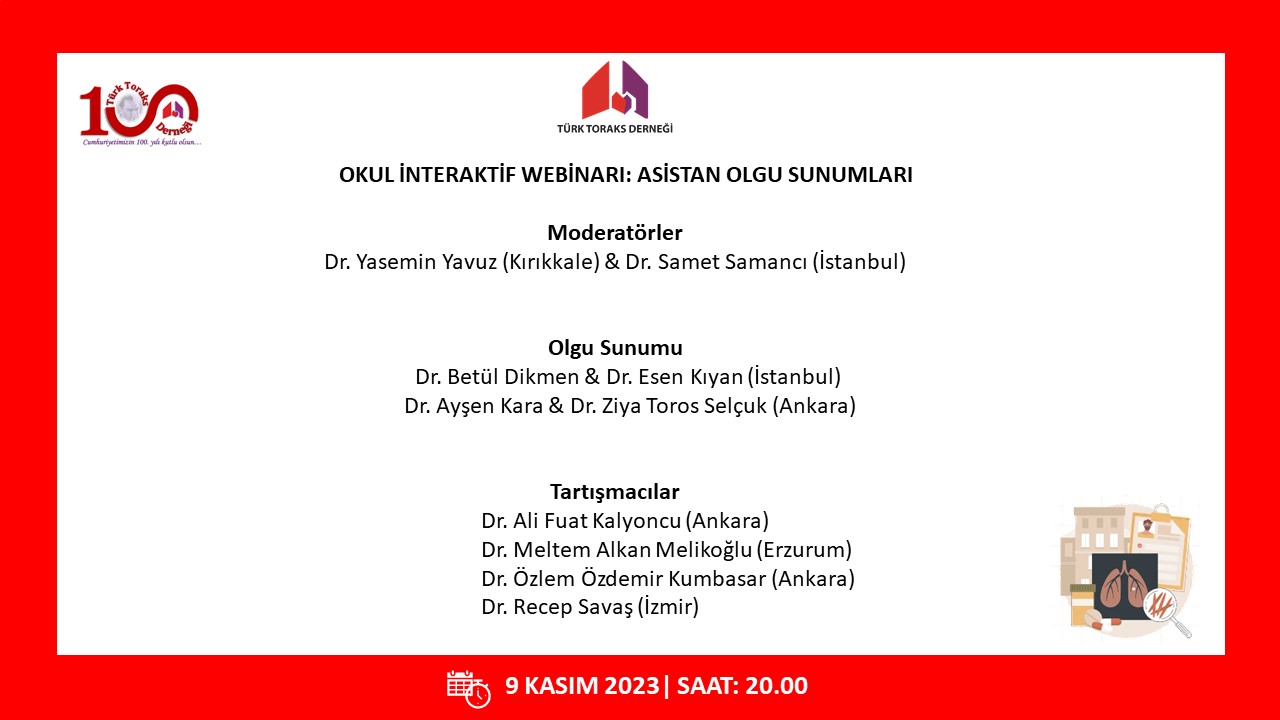 Türk Toraks Derneği okulu interaktif webinarının on üçüncüsü 9 Kasım 2023 Perşembe günü, saat 20.00 da “Asistan Olgu Sunumları” başlığı ile gerçekleştirilecek olup; katılımlarınız onur verecektir.
