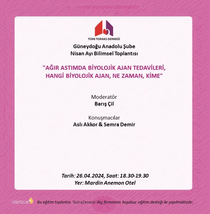 Türk Toraks Derneği Güneydoğu Anadolu Şube Nisan Ayı Bilimsel Toplantısı Duyurumuz: "Ağır Astımda Biyolojik Ajan Tedavileri, Hangi Biyolojik Ajan, Ne zaman, Kime"