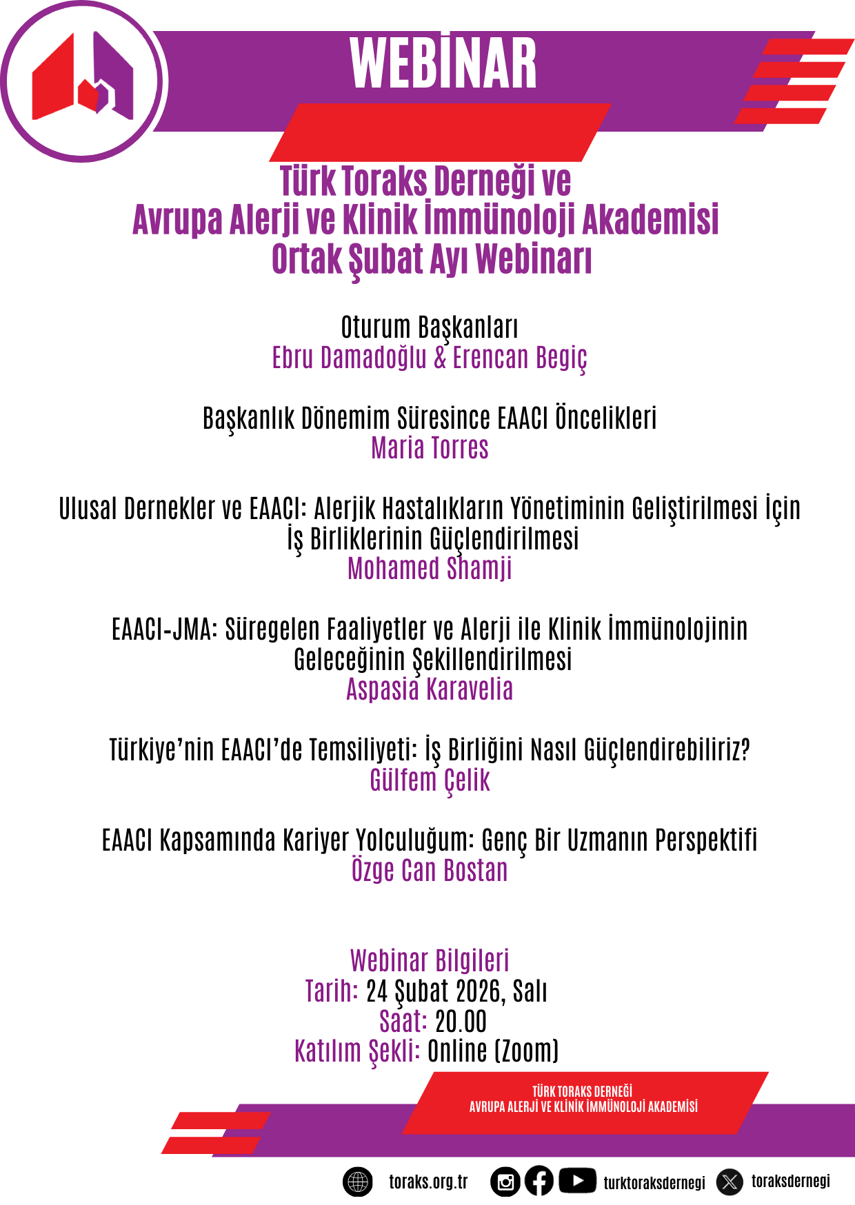Türk Toraks Derneği'nin Avrupa Alerji ve Klinik İmmünoloji Akademisi ile ortak düzenlediği Şubat ayı webinarı 24 Şubat 2026 Salı günü, 20.00-21.30 saatleri arasında online olarak gerçekleştirilecektir.