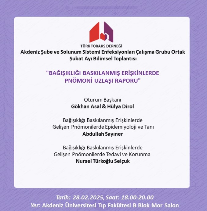 Türk Toraks Derneği Akdeniz Şubesi ve Solunum Sistemi Enfeksiyonları Çalışma Grubu Ortak Şubat Ayı Bilimsel Toplantı Duyurumuz: "Bağışıklığı Baskılanmış Erişkinlerde Pnömoni Uzlaşı Raporu"
