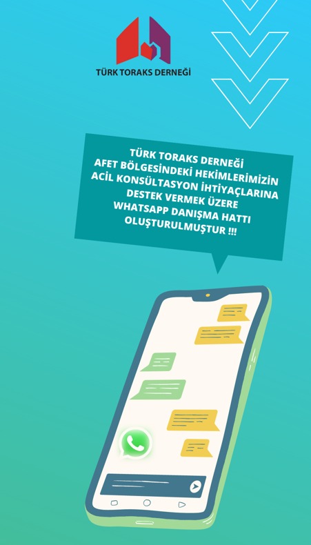 Türk Toraks Derneği Merkez Yönetim Kurulumuz tarafından, Kahramanmaraş ili merkezli meydana gelen deprem felaketi nedeniyle afet bölgesindeki hekimlerimizin acil konsültasyon ihtiyaçlarına destek vermek üzere WhatsApp Danışma Hattı oluşturmuştur.