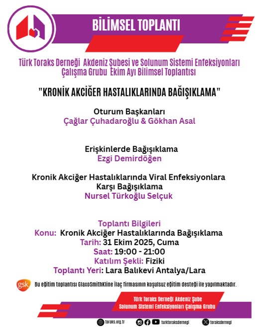 Türk Toraks Derneği Akdeniz Şubesi'nin Solunum Sistemi Enfeksiyonları Çalışma Grubu ortak düzenlediği Ekim ayı bilimsel toplantısı "Kronik Akciğer Hastalıklarında Bağışıklama" başlığı ile 31 Ekim 2025 Cuma günü, 19.00-21.00 saatleri arasında Antalya'da gerçekleştirilecektir.