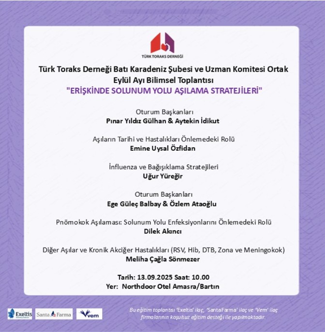 Türk Toraks Derneği Batı Karadeniz Şubesi ve Uzman Komitesi Ortak Eylül Ayı Bilimsel Toplantısı Duyurumuz: "Erişkinde Solunum Yolu Aşılama Stratejileri"