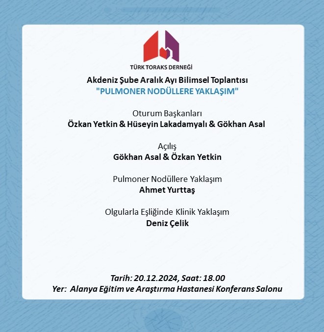 Türk Toraks Derneği Akdeniz Şube Aralık Ayı Bilimsel Toplantı Duyurumuz: "Pulmoner Nodüllere Yaklaşım"
