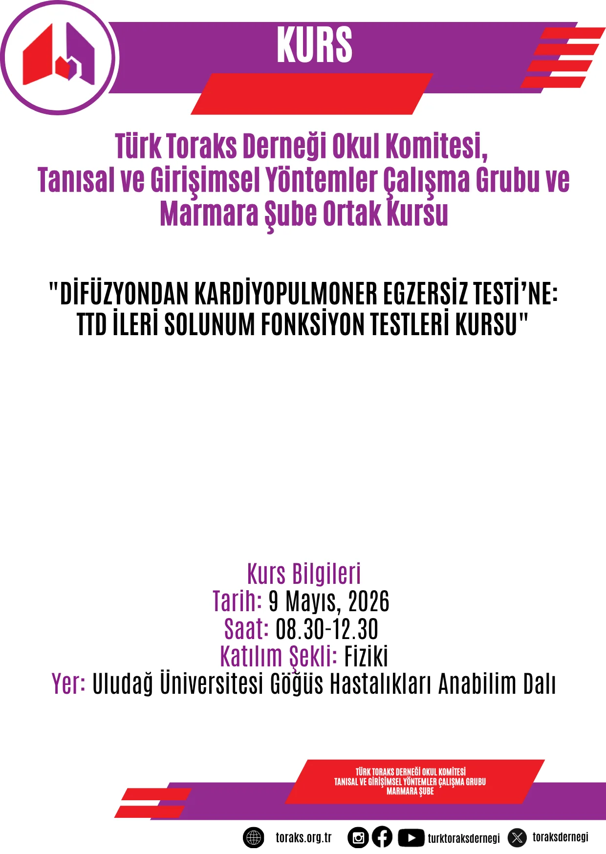 Türk Toraks Derneği Okul Komitesi, Tanısal ve Girişimsel Yöntemler Çalışma Grubu ve Marmara Şubesi ortak "Difüzyondan Kardiyopulmoner Egzersiz Testi’ne: TTD İleri Solunum Fonksiyon Testleri Kursu" 9 Mayıs 2026 Cumartesi günü 08.30 da Bursa'da yapılacaktır.