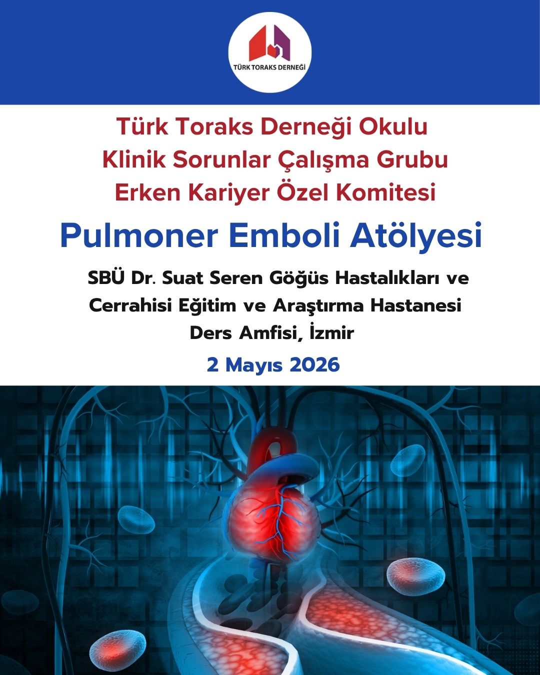 Türk Toraks Derneği Okulu, Klinik Sorunlar Çalışma Grubu ve Erken Kariyer Özel Komitesi tarafından planlanan "Pulmoner Emboli Atölyesi" programı 2 Mayıs 2026 tarihinde İzmir’de gerçekleştirilecektir.