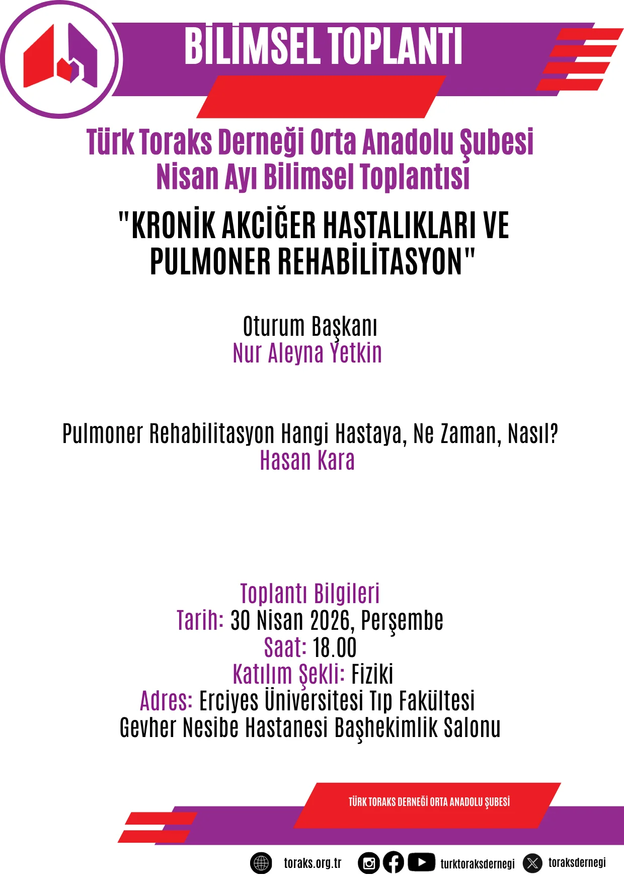 Türk Toraks Derneği Orta Anadolu Şubesi Nisan ayı bilimsel toplantısı 30 Nisan 2026 Perşembe günü, saat 18.00 de Kayseri'de gerçekleştirilecektir.