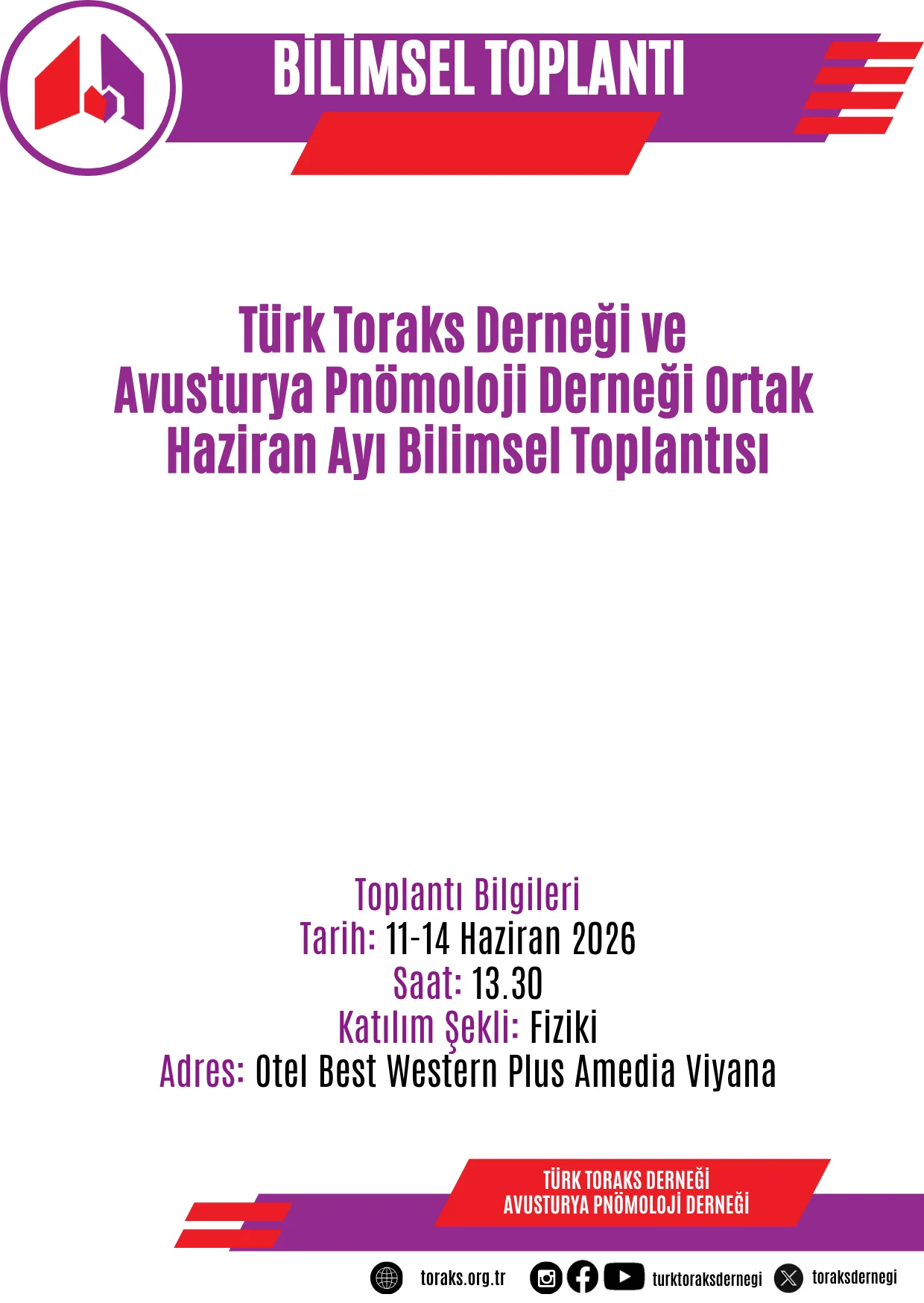 Türk Toraks Derneği’nin Avusturya Pnömoloji Derneği ile ortak düzenlediği Haziran ayı bilimsel toplantısı 11-14 Haziran 2026 tarihleri arasında Viyana’da gerçekleştirilecektir.