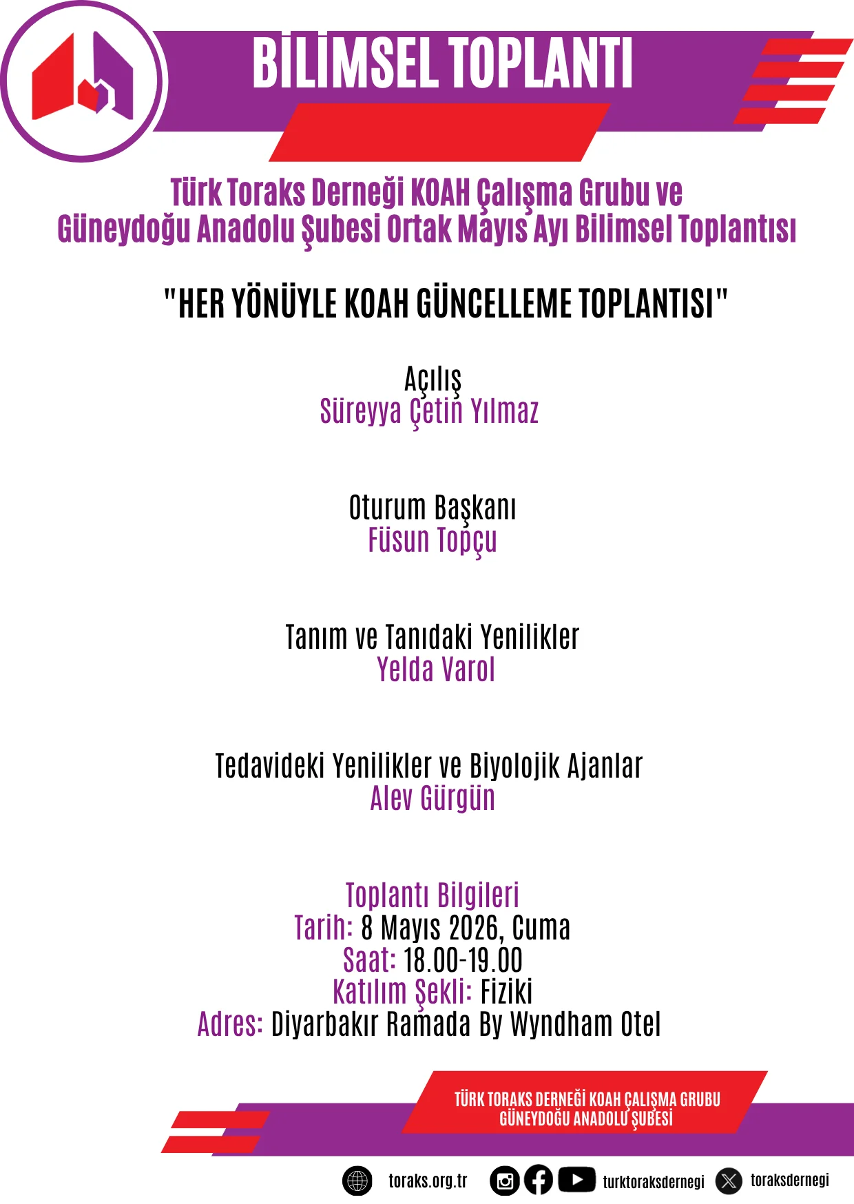 Türk Toraks Derneği KOAH Çalışma Grubu'nun Güneydoğu Anadolu Şubesi ile ortak düzenlediği Mayıs ayı bilimsel toplantısı "Her Yönüyle KOAH Güncelleme Toplantısı" başlığı ile 8 Mayıs 2026 Cuma günü, 18.00-19.00 saatleri arasında Diyarbakır' da gerçekleştirilecektir.