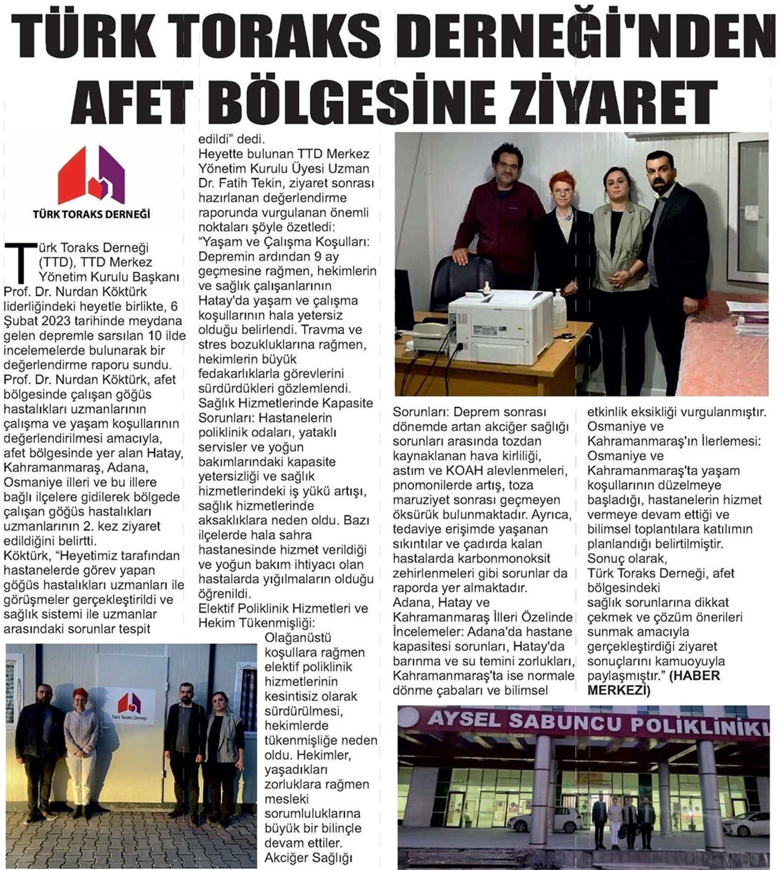 Basında Türk Toraks Derneği "Afet Bölgesi Ziyareti Bilgilendirme ve Değerlendirme Raporu"