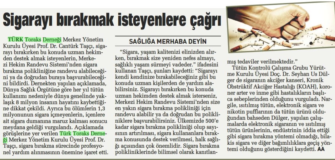 Basında Türk Toraks Derneği Tütün Kontrolü Çalışma Grubu "9 Şubat Sigarayı Bırakma Günü" Basın Bildirisi