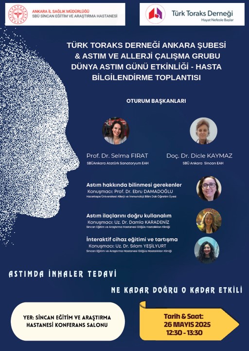 Dünya Astım günü nedeni ile Türk Toraks Derneği Ankara Şubesi ile Astım ve Allerji Çalışma Grubu ortak etkinliği olarak 26 Mayıs 2025 Pazartesi günü, 12.30-13.30 saatleri arasında “Hasta Bilgilendirme Toplantısı” gerçekleştirecektir.