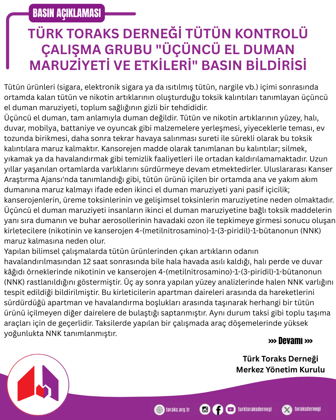 Türk Toraks Derneği' nin "Üçüncü El Duman Maruziyeti ve Etkileri" ile ilgili basın bildirisine aşağıdaki linkten ulaşabilirsiniz.