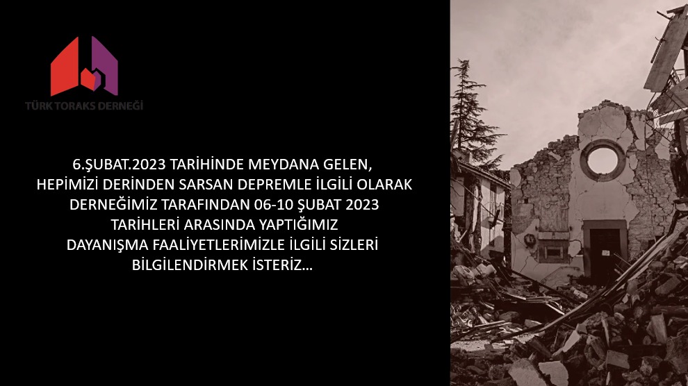 6.Şubat.2023 tarihinde meydana gelen, hepimizi derinden sarsan depremle ilgili olarak Türk Toraks Derneği (TTD) tarafından 06-10 Şubat 2023 tarihleri arasında yaptığımız dayanışma faaliyetlerimizle ilgili sizleri bilgilendirmek isteriz: