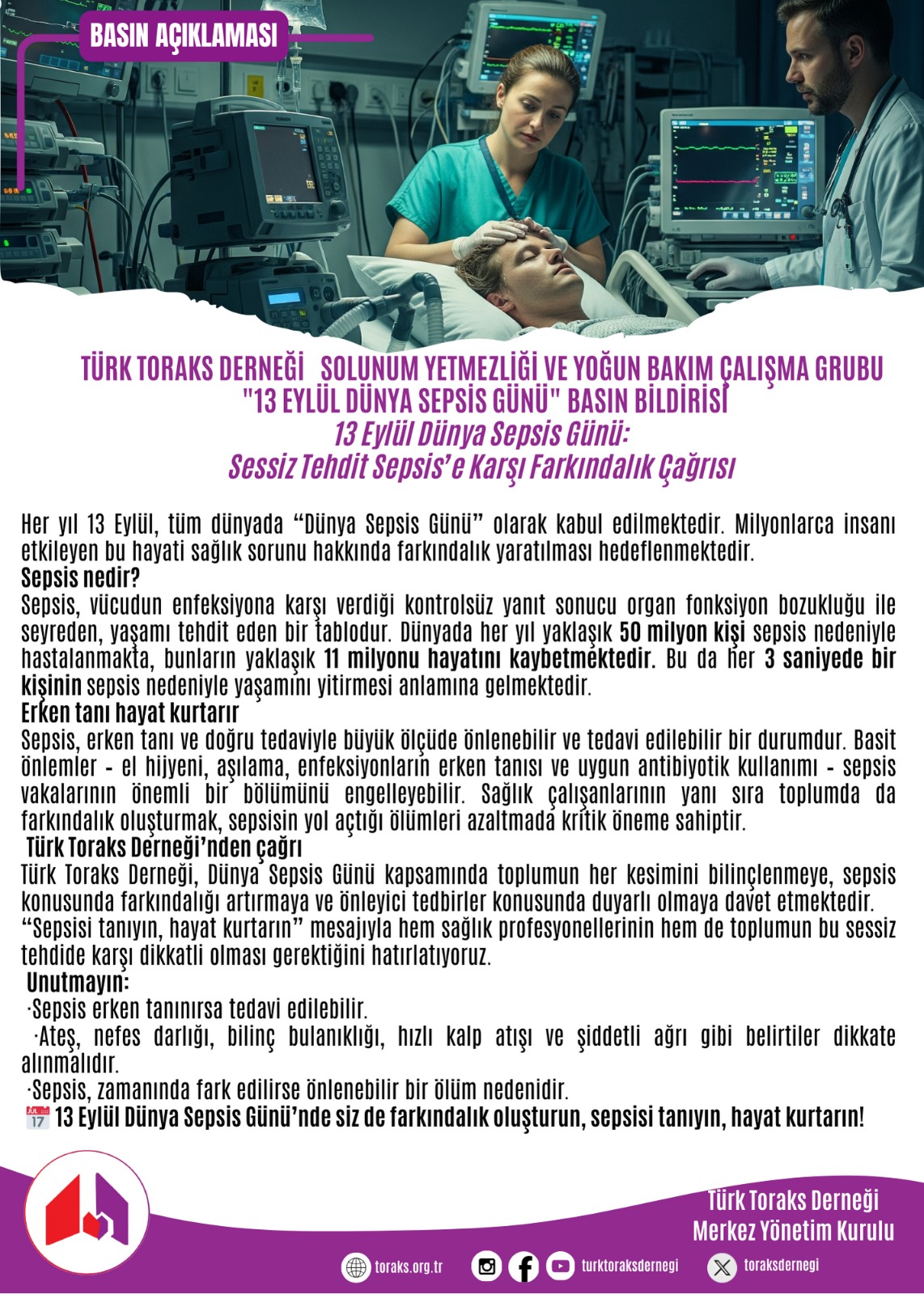 Türk Toraks Derneği Solunum Yetmezliği ve Yoğun Bakım Çalışma Grubu "13 Eylül Dünya Sepsis Günü" Basın Bildirisi