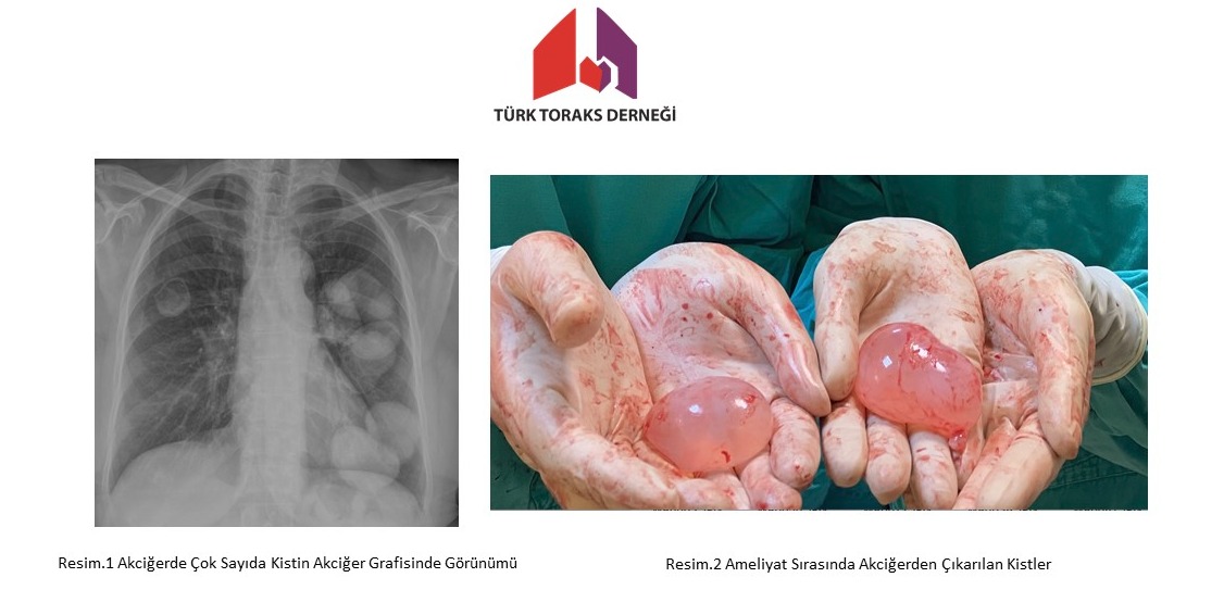 Hastaneye başvurulduğunda akciğer kaynaklı şikayetleri olan hastanın çekilen akciğer grafisinde, düzgün sınırlı, içi radyo-opak görünümde, yada patlamış kisti olan hastaların için hava-sıvı seviyesi verebilen kistler dikkat çeker. Bir veya daha fazla sayıda kist görülebilir.(Resim.1)