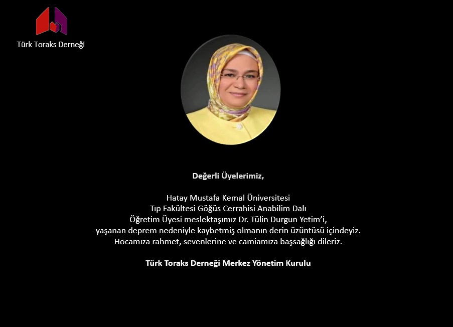Hatay Mustafa Kemal Üniversitesi Tıp Fakültesi Göğüs Cerrahisi Anabilim Dalı Öğretim Üyesi meslektaşımız Dr. Tülin Durgun Yetim’i, yaşanan deprem nedeniyle kaybetmiş olmanın derin üzüntüsü içindeyiz.