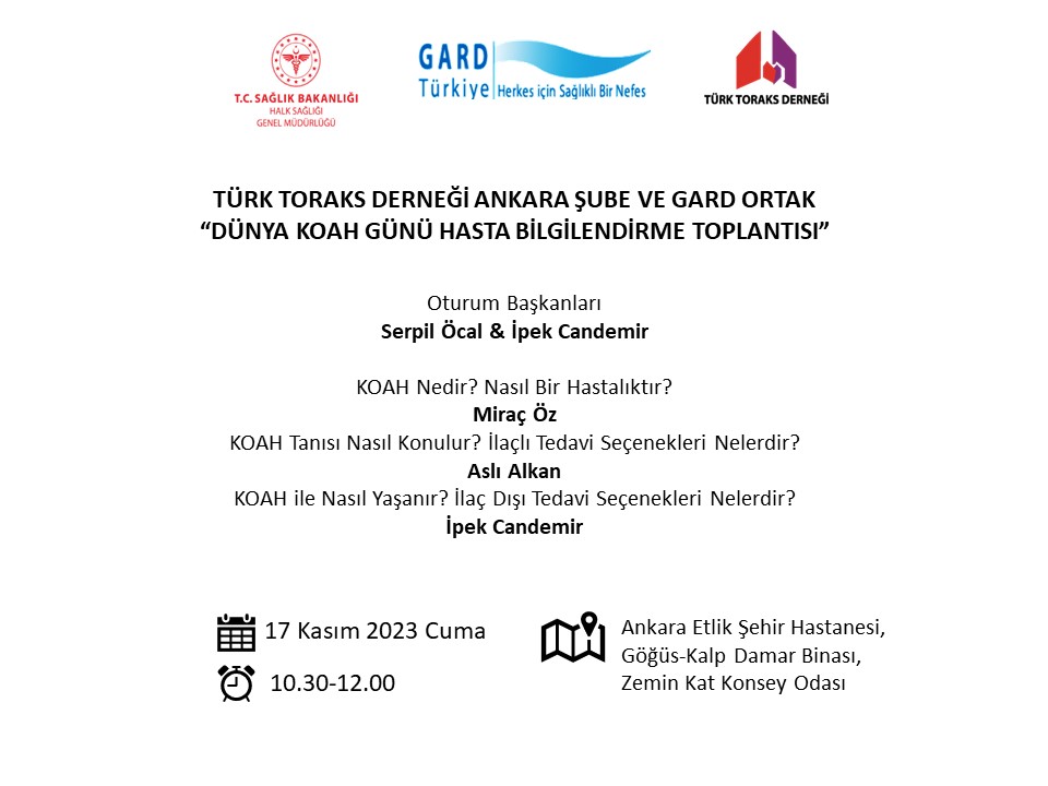 Dünya KOAH günü nedeni ile Türk Toraks Derneği Ankara Şubesi ile GARD ortak etkinliği olarak 17 Kasım 2023 Cuma günü “KOAH Hasta Bilgilendirme Toplantısı” gerçekleştirecektir.