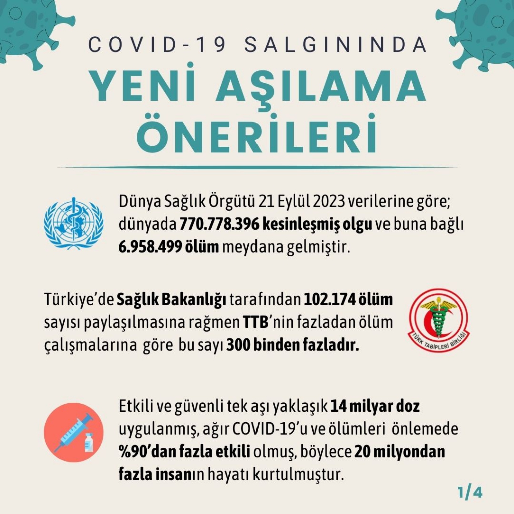 COVID-19 salgını yeni varyantlarla sürüyor. Bu nedenle COVID-19’un yakından izlenmesi, Türk Tabipleri Birliği ve ilgili uzmanlık dernekleriyle iş birliği yapılması ve kamuoyuyla doğru şeffaf bilgi paylaşımına ihtiyaç duyulmaktadır. Toplumun hem COVID-19 hem de diğer bulaşıcı hastalıklardan korunması için bilimsel gerçeklerin ışığında gerekli önlemlerin alınması, COVID-19 salgını süresince yapılan hatalardan ders çıkarılıp aşı kararsızlığıyla mücadele dahil toplum sağlığına yönelik her türlü düzenlemenin toplumun da içinde olduğu şekilde yapılması, yeni COVID-19 aşılarının temin edilip belirlenen yüksek riskli gruplara uygulanması gelecek için hayati önemdedir.