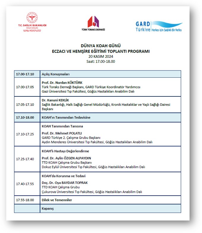 Dünya KOAH Günü nedeni ile T. C. Sağlık Bakanlığı Halk Sağlığı Genel Müdürlüğü, GARD Türkiye ve Türk Toraks Derneği ortak "Eczacı ve Hemşire Eğitimi" toplantı programı 20 Kasım 2024 Çarşamba günü, 17.00-18.00 saatleri arasında online olarak gerçekleştirilecektir.