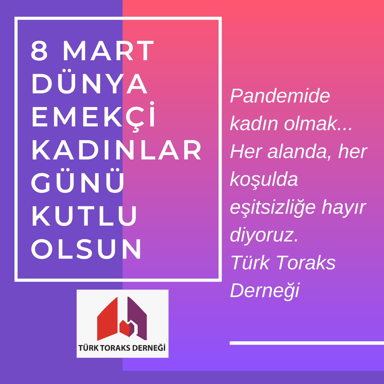 Türk Toraks Derneği Kadın ve Akciğer Sağlığı Görev Grubu olarak, toplumsal cinsiyet kavramı konusunda duyarlılık oluşturmak kararlılığı ile "8 Mart Dünya Emekçi Kadınlar Günü"nde kadınların ve kız çocuklarının davasını temsil eden, eşitlik özgürlük mücadelesinde kaybettiğimiz tüm kadınları ve Covid-19 pandemisinde canhıraş bir şekilde çalışan kaybettiğimiz tüm sağlık çalışanlarımızı saygı ile anıyoruz.