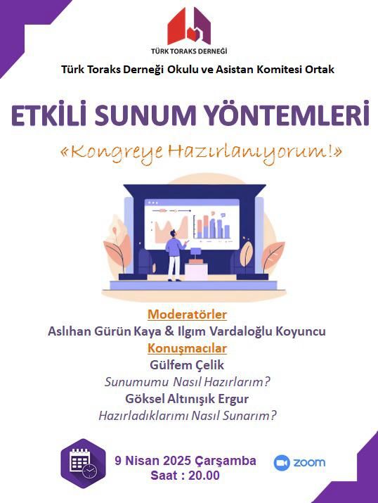 Türk Toraks Derneği Okulu ve Asistan Komitesi olarak düzenlediğimiz "Etkili Sunum Yöntemleri Kursu" 9 Nisan 2025 Çarşamba günü, saat: 20.00’ da online olarak gerçekleştirilecektir.