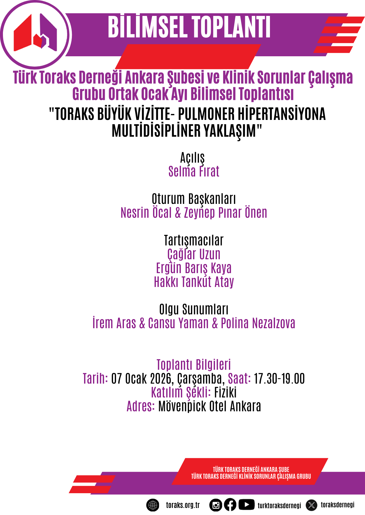Türk Toraks Derneği Ankara Şube ve Klinik Sorunlar Çalışma Grubu Ortak Ocak Ayı Bilimsel Toplantı Duyurumuz: "Toraks Büyük Vizitte- Pulmoner Hipertansiyona Multidisipliner Yaklaşım"