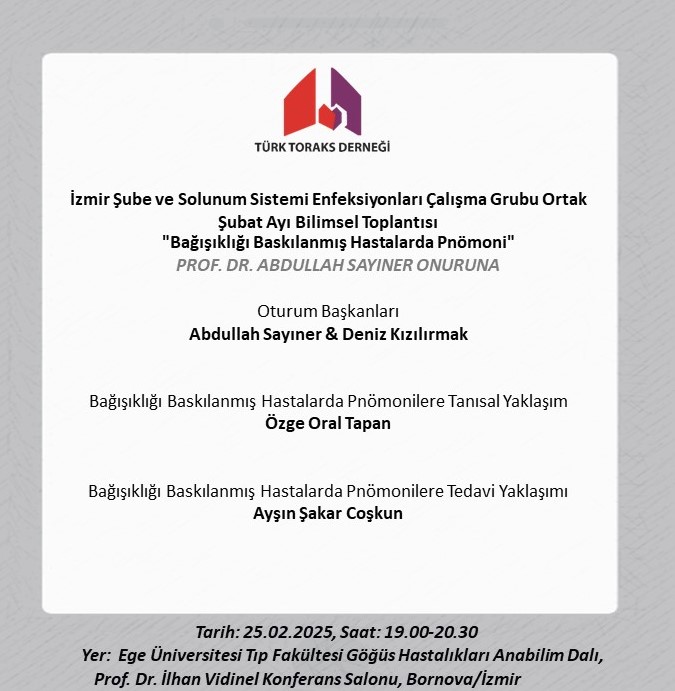 Türk Toraks Derneği İzmir Şubesi ve Solunum Sistemi Enfeksiyonları Çalışma Grubu Ortak Şubat Ayı Bilimsel Toplantı Duyurumuz: "Bağışıklığı Baskılanmış Hastalarda Pnömoni"