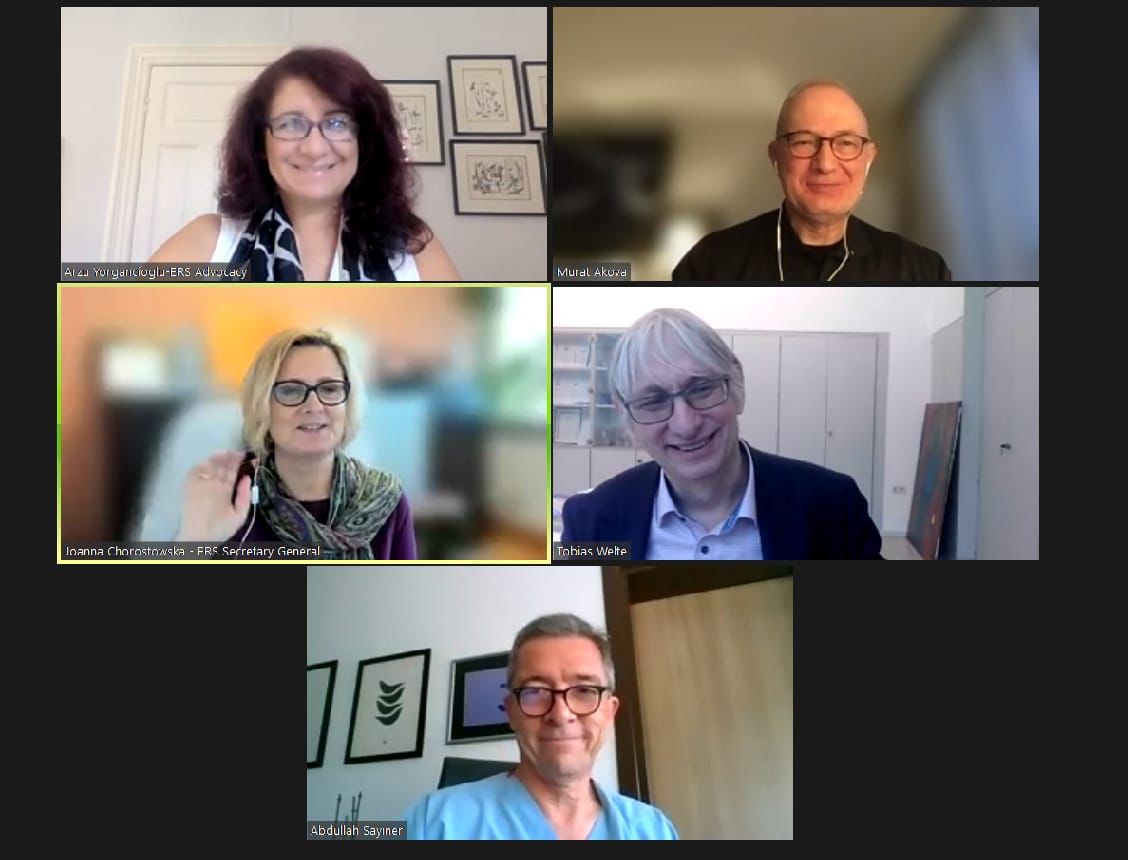 ERS ve TTS işbirliğiyle düzenlenen “Covid-19 vaccination and more" başlıklı webinar toplantımız yüksek katılımla gerçekleşti. Toplantıyı modere eden Prof. Dr. Arzu Yorgancıoğlu ve Prof. Dr. Joanna Chorostowska-Wynimko'ya, harika konuşmaları için ERS önceki dönem başkanlarından Prof. Dr. Tobias Welte, Prof. Dr. Abdullah Sayıner ve Prof. Dr. Murat Akova 'ya ve toplantıyı takip eden tüm üyelerimize yürekten teşekkürlerimizi iletiriz. Webinar kaydı daha sonra ERS Respiratory Channel üzerinden yeniden izlenebilecektir.