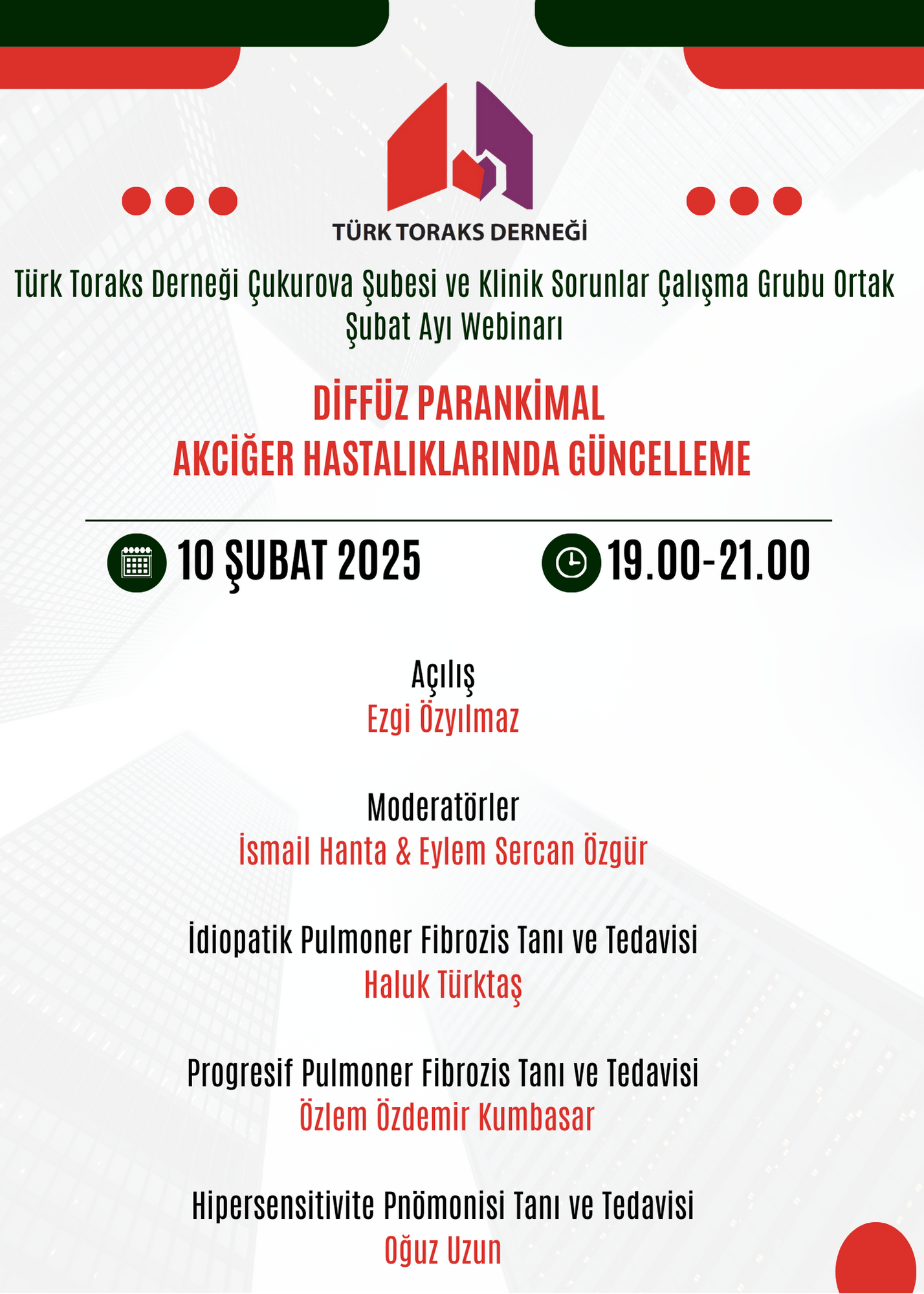 Türk Toraks Derneği Çukurova Şubesi ve Klinik Sorunlar Çalışma Grubu Ortak Şubat Ayı Webinar Duyurumuz: "Diffüz Parankimal Akciğer Hastalıklarında Güncelleme"