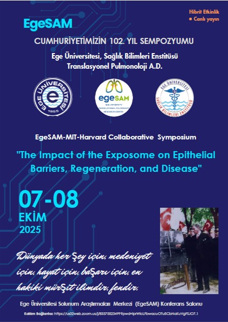 7-8 Ekim 2025 tarihleri arasında Ege Üniversitesi Solunum Araştırmaları Merkezi (EgeSAM) ev sahipliğinde, Massachusetts Institute of Technology (MIT) ve Harvard Üniversitesi ortaklığıyla “Cumhuriyetimizin 102. Yılı Sempozyumu: Ekspozomların Epitel Bariyer, Rejenerasyon ve Hastalıklar Üzerine Etkisinin Değerlendirilmesi” başlıklı sempozyum gerçekleştirilecektir.